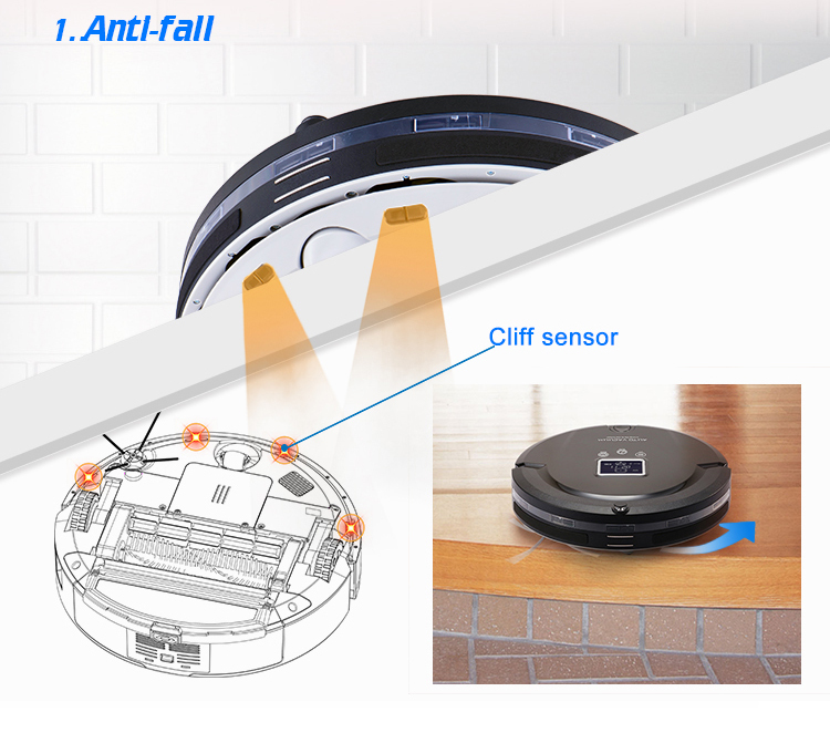 6. Оснащен сенсорами перепада высоты, распознает ступеньки, иные перепады и избегает падения.